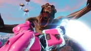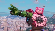 Using the orb's energy, Mecha delivered a powerful punch, knocking The Devourer to the ground. Mecha then grabbed the statue from Neo Tilted, which was revealed to be a hidden sword. Injecting the orb's energy into the sword before both opponent jumped at each other in a dramatic slow-motion scene, Mecha stabbed The Devourer through its single eye, ultimately defeating the beast. With the battle over, Mecha performed the No Sweat Emote—a version of the Floss with only one arm—saluted the Island, and then flew off to The Ice Moon.